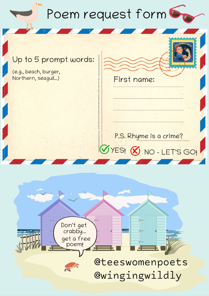 In summer 2025, Hartlepool Borough Council offered Tees Women Poets the use of the beach huts in Seaton Carew for creative activities, and I was lucky enough to be involved. I had the idea of getting prompt words from passers-by and writing them their own poem within ten minutes. This might sound intimidating, but actually, something about the external prompts and time limit seemed quite freeing! I knew I wouldn’t have time to overthink or agonise over word choices.