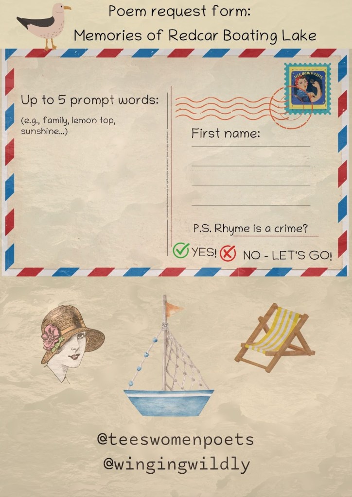 When TWP were asked by Redcar & Cleveland Council to take part in memory gathering for the re-opening of the Boating Lake, I thought this could be a good opportunity to run the activity again. I adapted my prompt form for the occasion, dressed up as Rosie the Riveter (the TWP mascot), and set off to meet the other poets at TunedIn! Redcar. Again, my expectations of the public engagement were modest, and again they were blown out of the water!